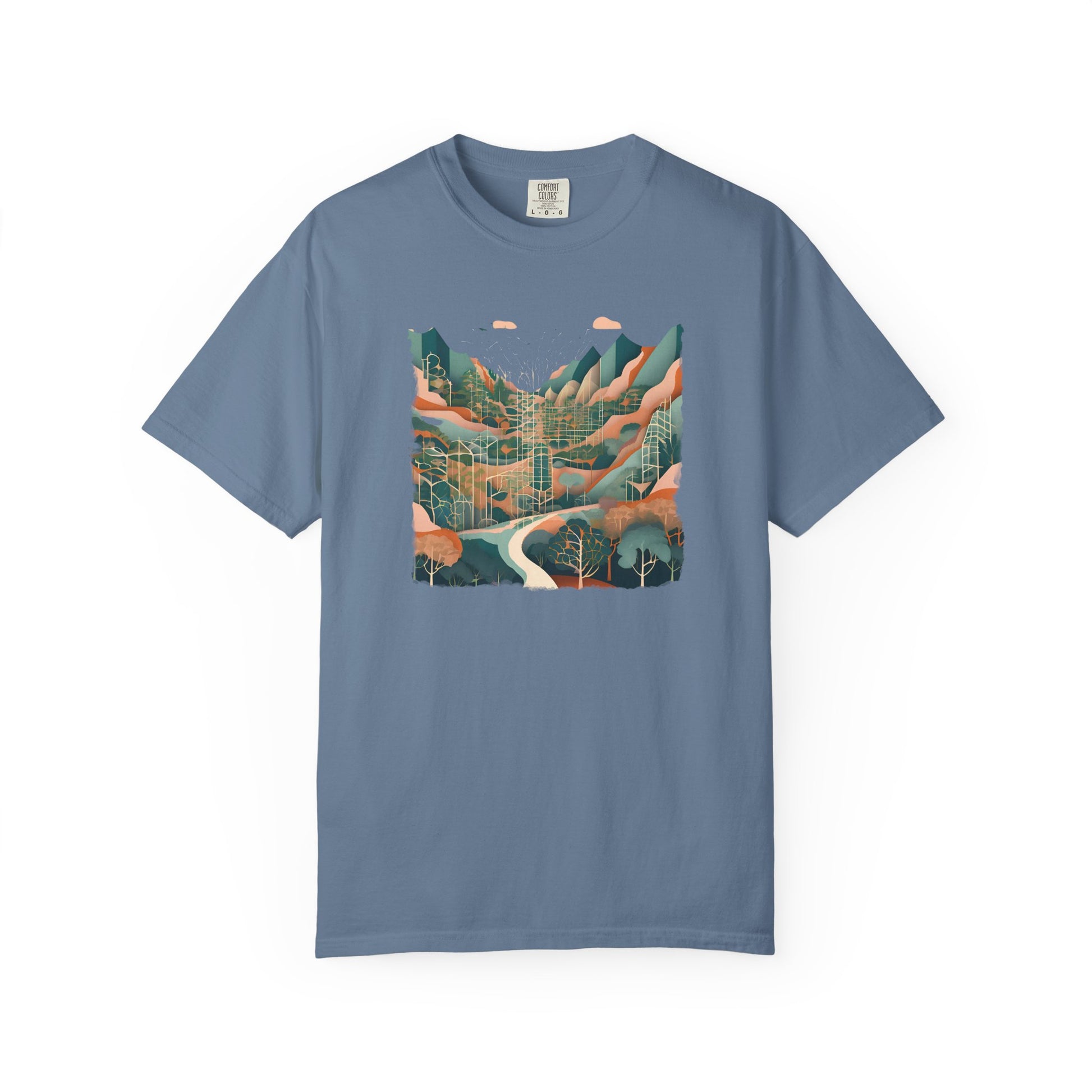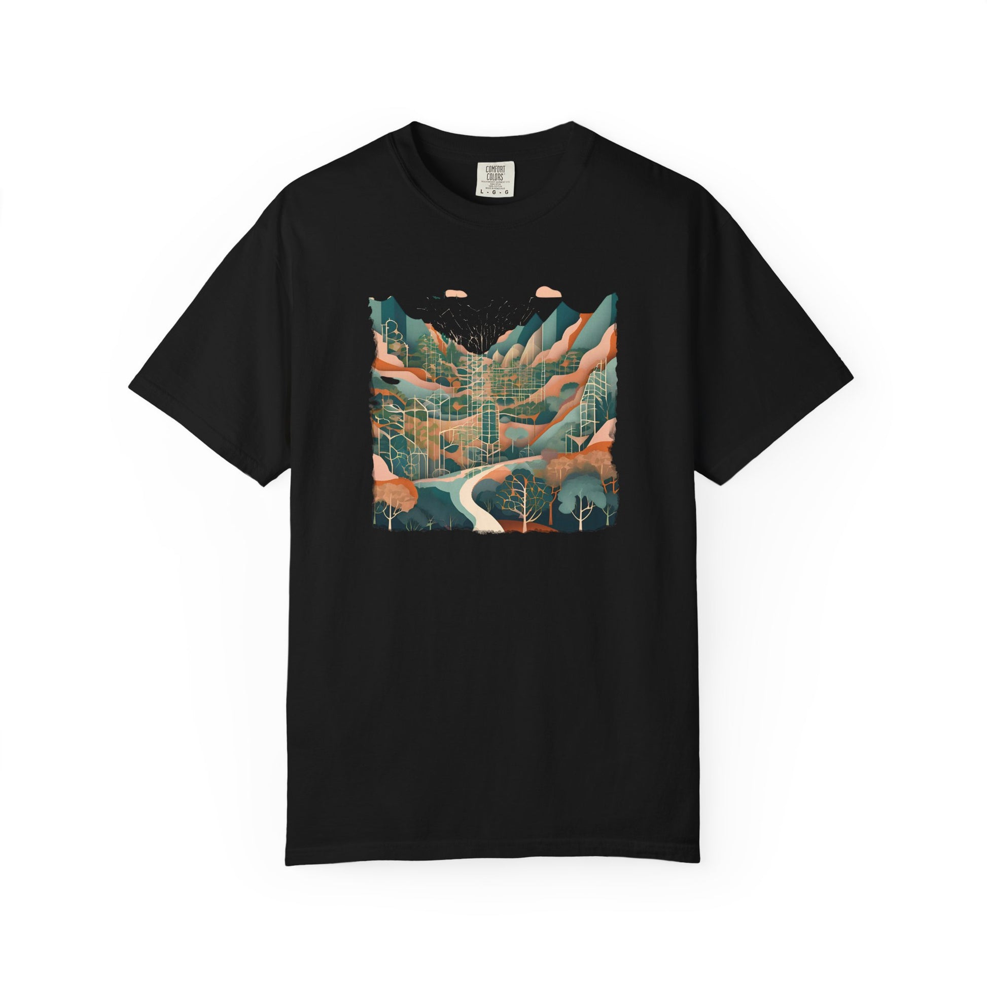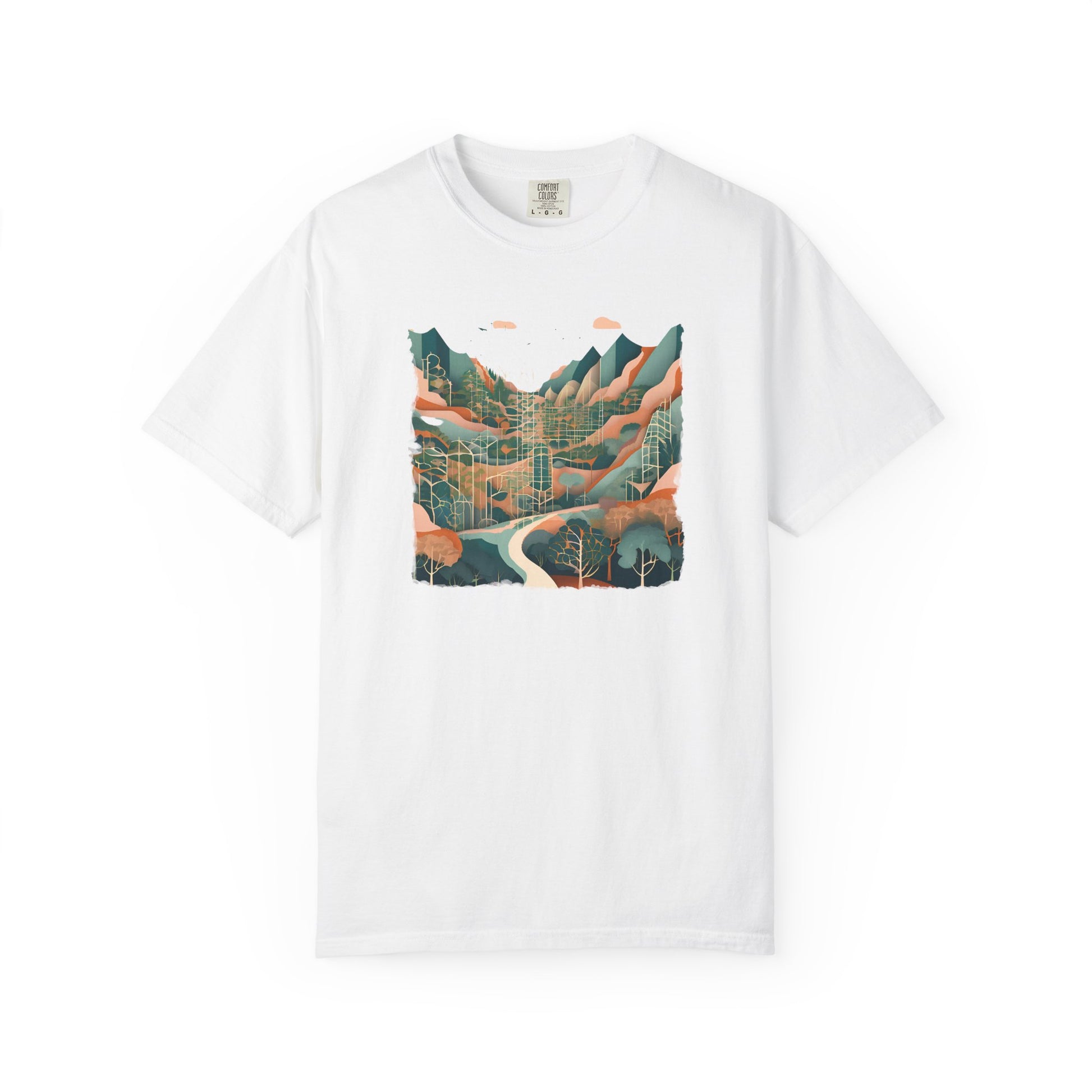 Step onto a path that winds between reality and reverie with the Abstract Forest T-shirt. This serene yet striking design captures a forest trail flanked by whispering trees, with distant mountains rising on the horizon—reimagined through soft hues and abstract forms.