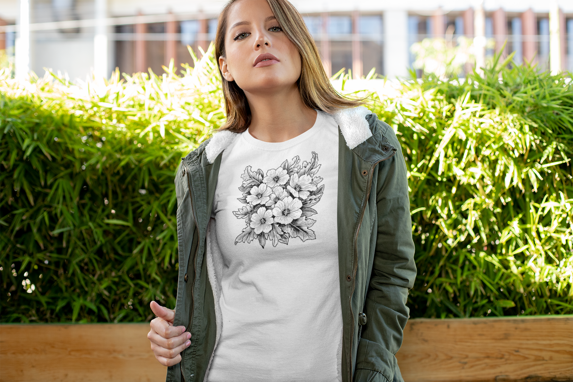 Timeless and effortlessly cool, the Black & White Bouquet T-shirt brings nature’s quiet poetry to your everyday look. This design features a delicate floral composition in bold monochrome, blooming with contrast, mystery, and meaning. It's art for your body—simple, stylish, and rooted in the raw beauty of the natural world.