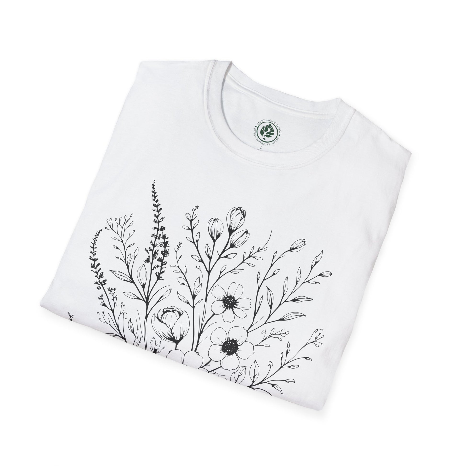Bring the calm elegance of nature into your everyday look with this botanical floral shirt — a soft cotton tee featuring a hand-drawn bouquet of wildflowers in intricate line art.