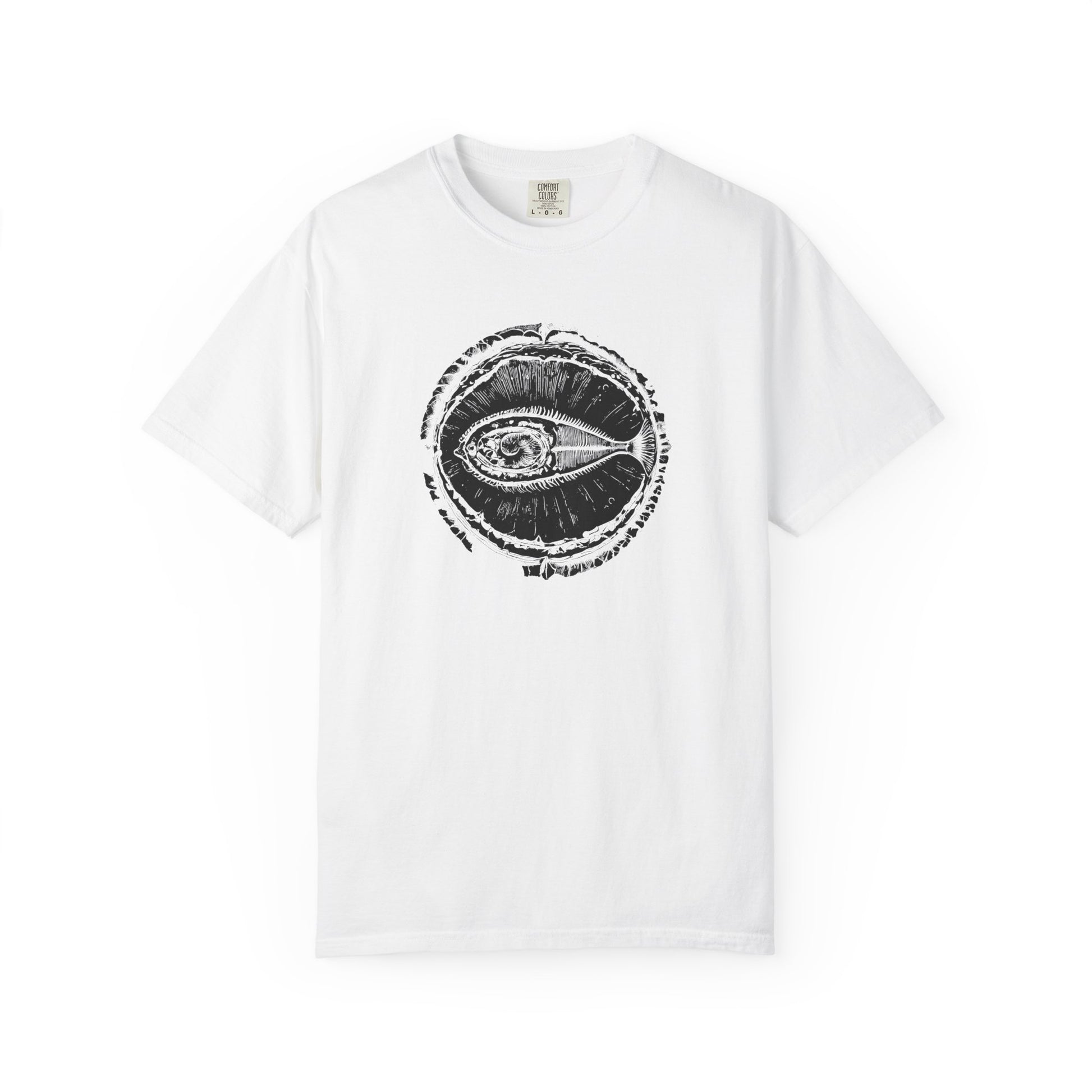 Dive into the surreal with the Fish In A Bubble Section T-shirt—a conceptual artwork where marine life meets architectural logic. This unique design features a dreamlike fish, encased in a cellular envelope and rendered as if sliced through in a precise architectural section.