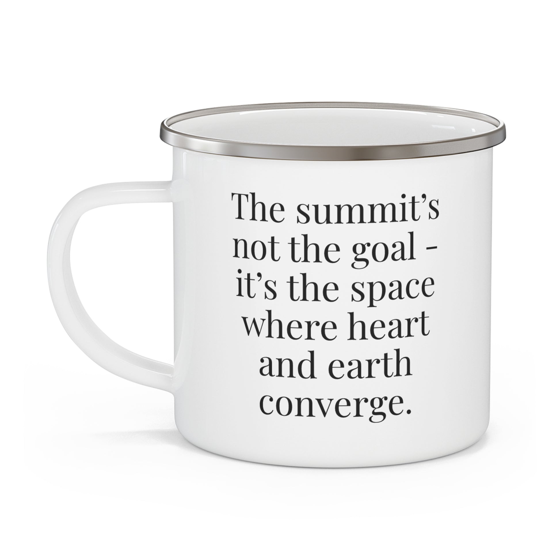 Featuring a minimalist mountain illustration on one side and the poetic quote "The summit’s not the goal — it’s the space where heart and earth converge." on the other, this mug celebrates wanderlust, mindfulness, and the call of the outdoors.